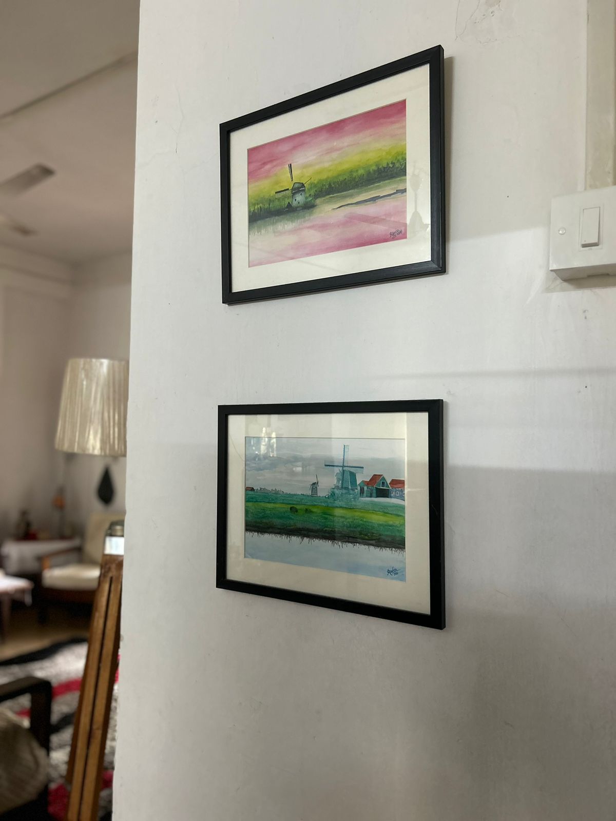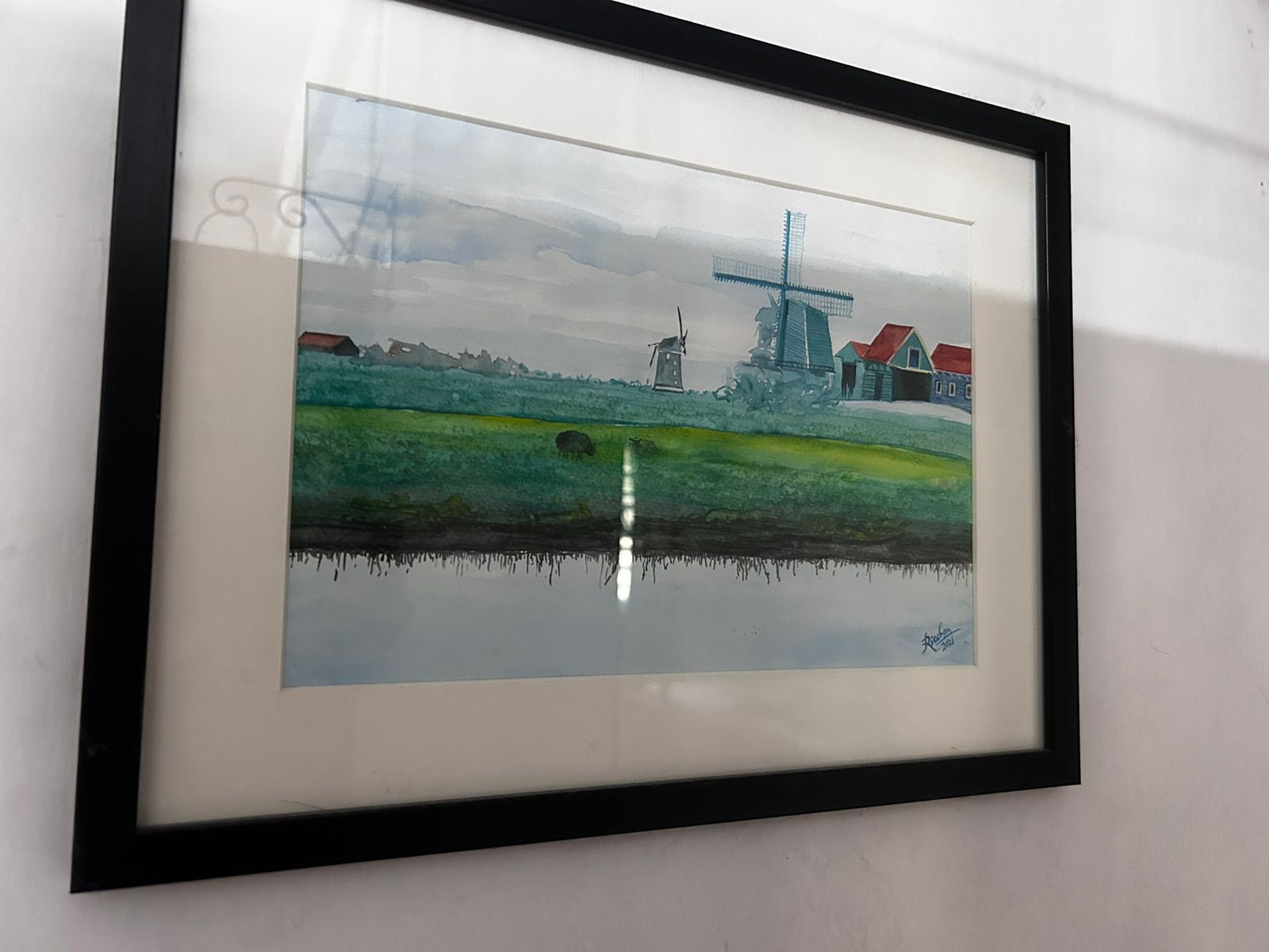 Bring a piece of Europe into your space with this handcrafted watercolor painting of an Amsterdam windmill, delicately painted on A4-size paper and framed to a final size of 10×12 inches. The artwork captures the tranquil essence of the Dutch countryside—windmill blades turning gently under a soft sky, evoking a peaceful, timeless charm.