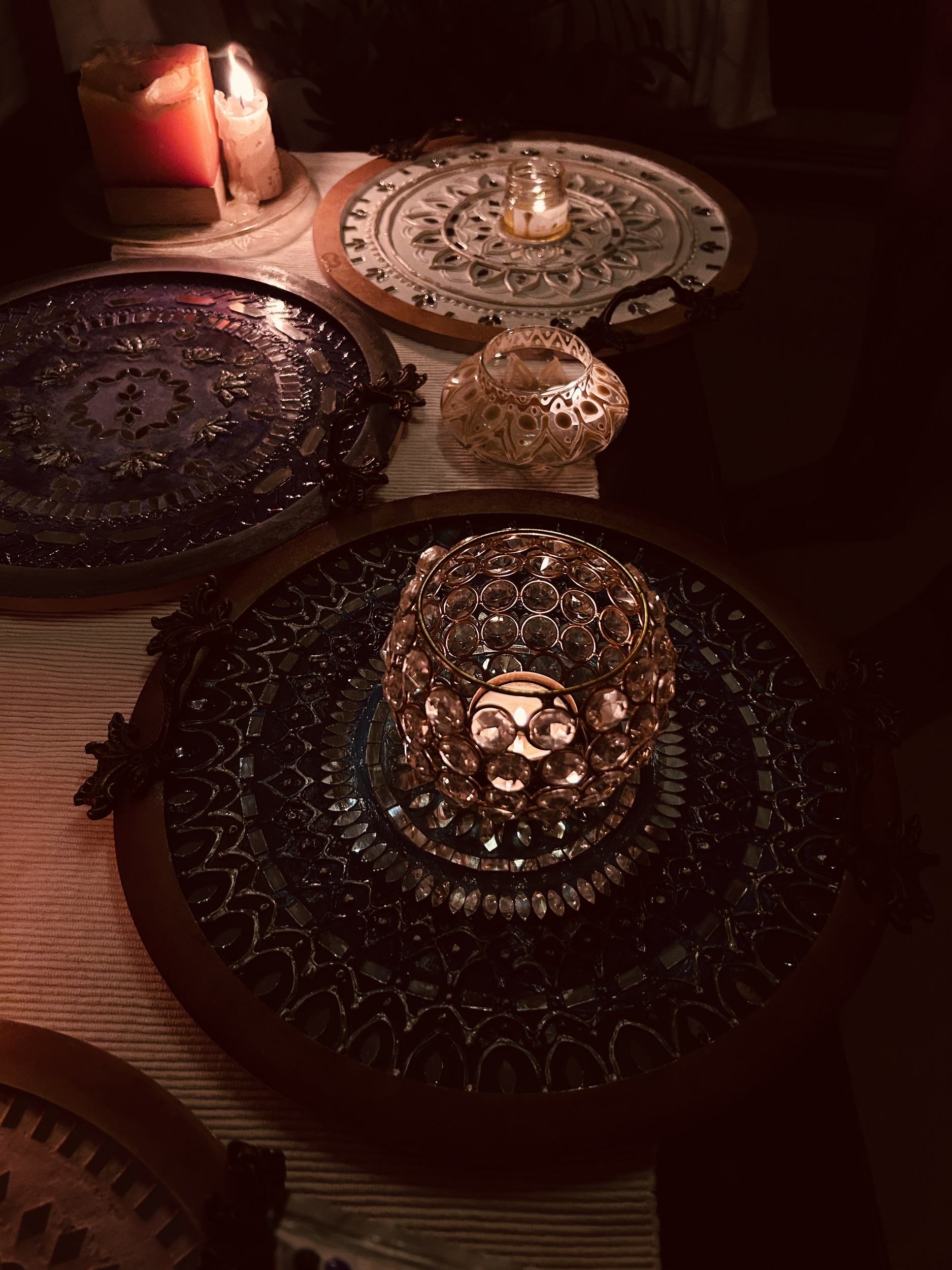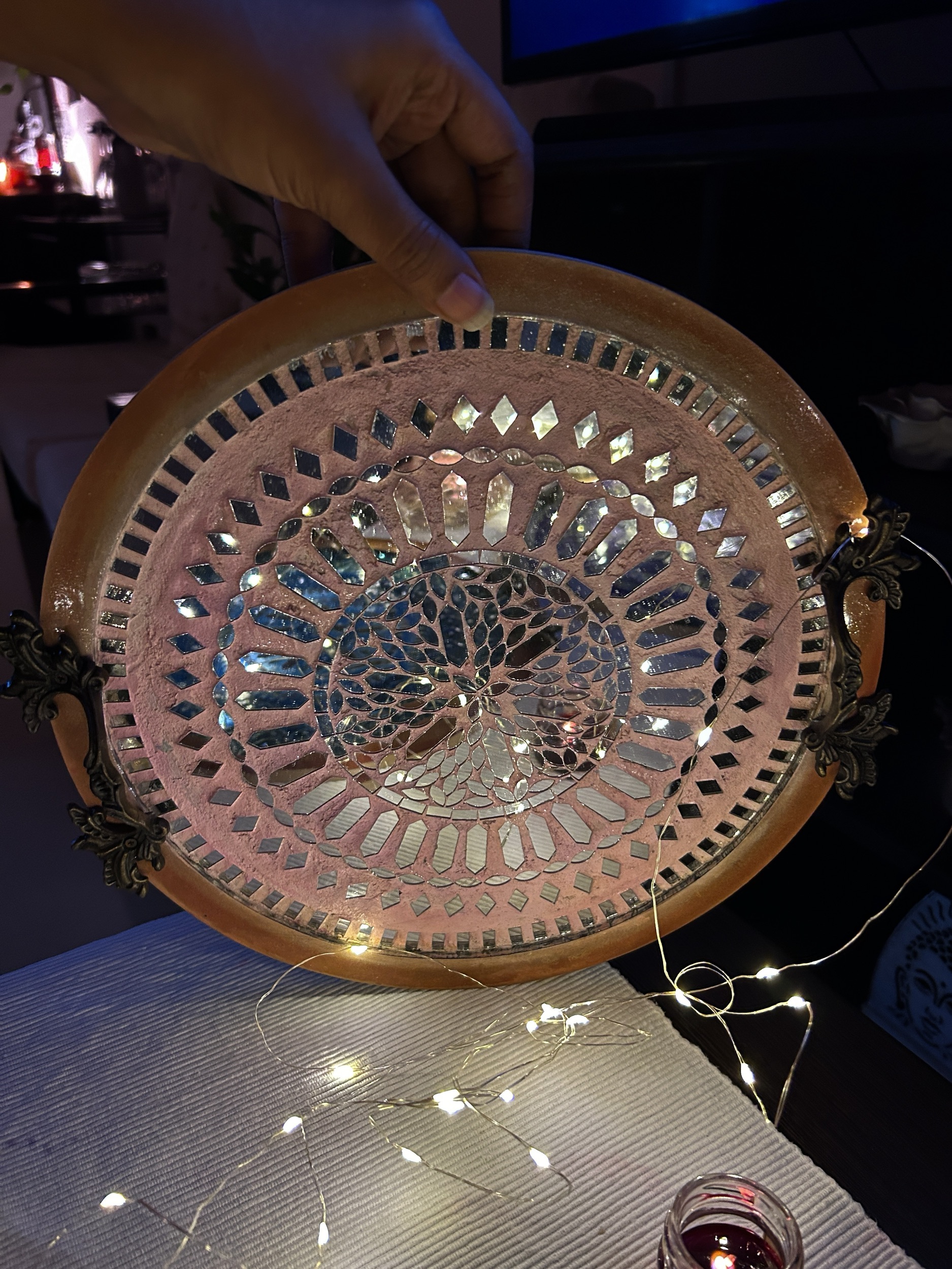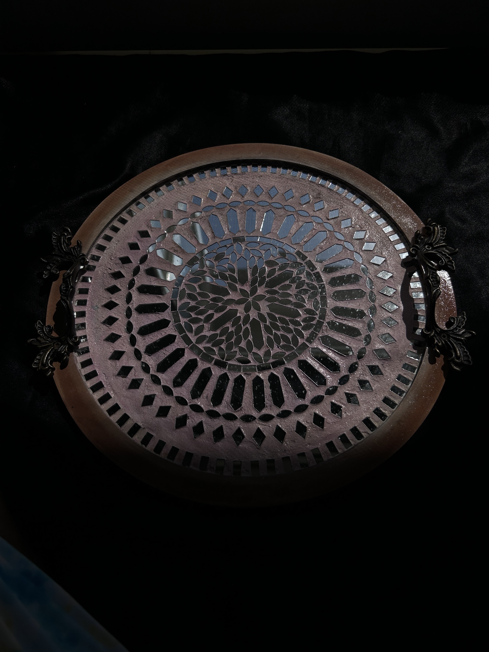 The mirror work reflects best in warm lights.
