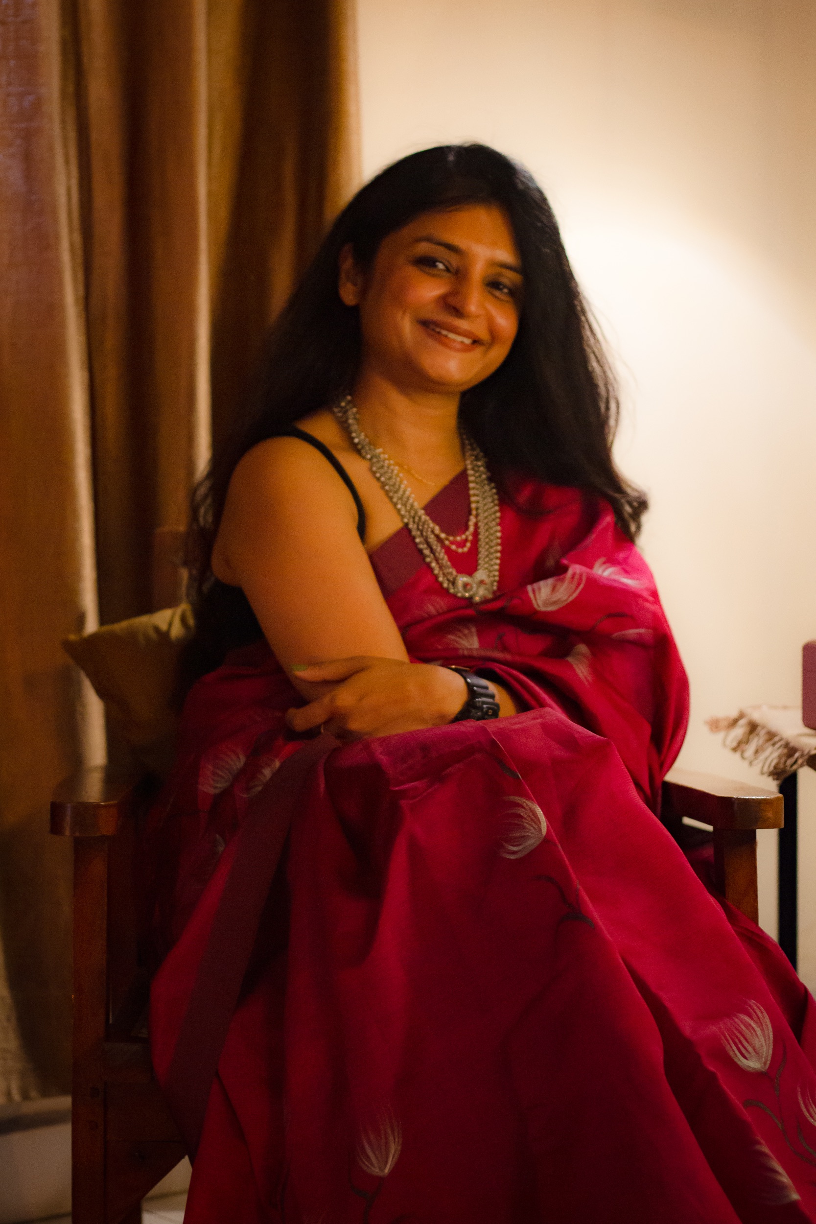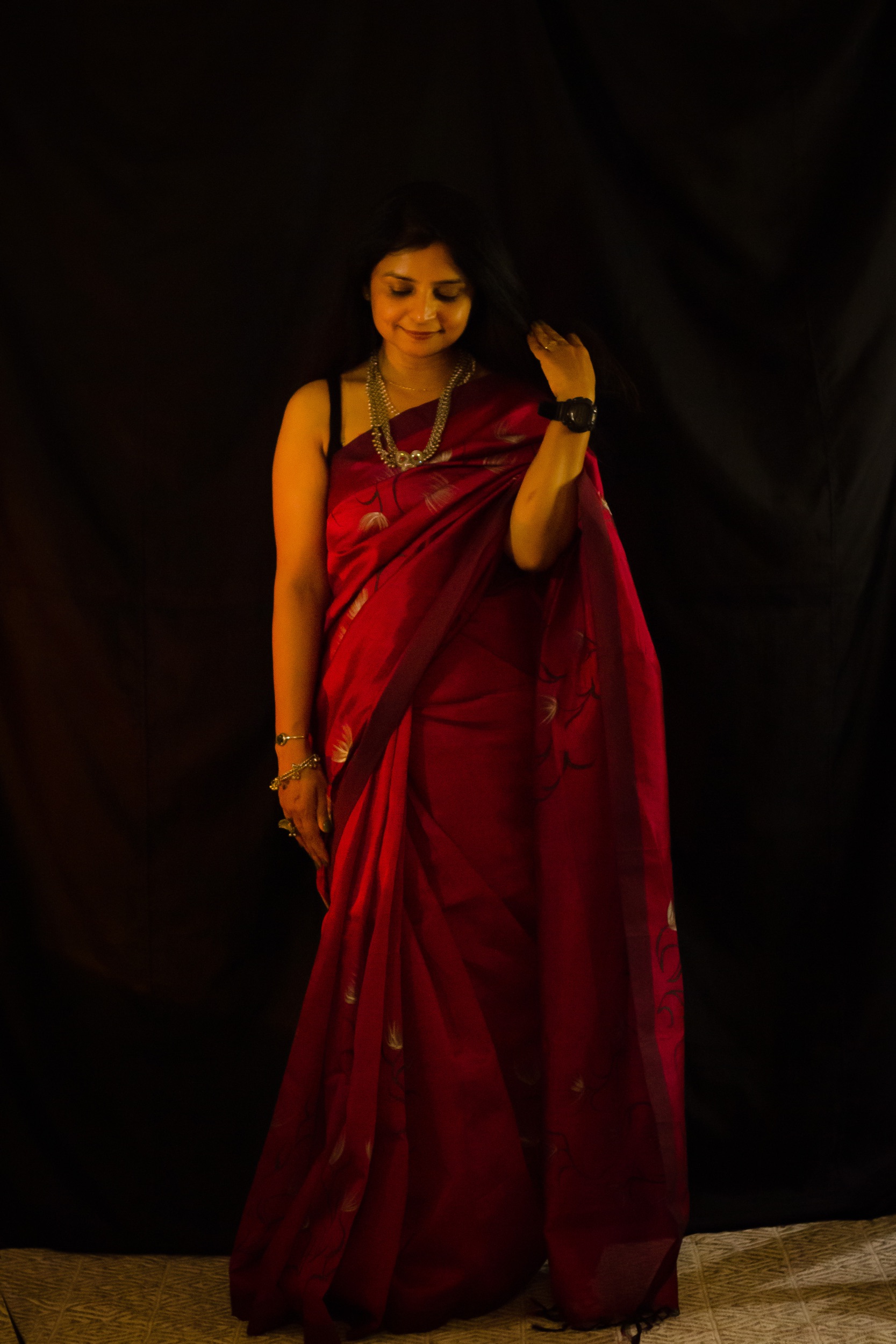 A striking Mangalagiri silk saree in deep dark red, enhanced with delicate hand painted silver floral motifs. This saree beautifully reflects traditional elegance with a refined artistic finish.