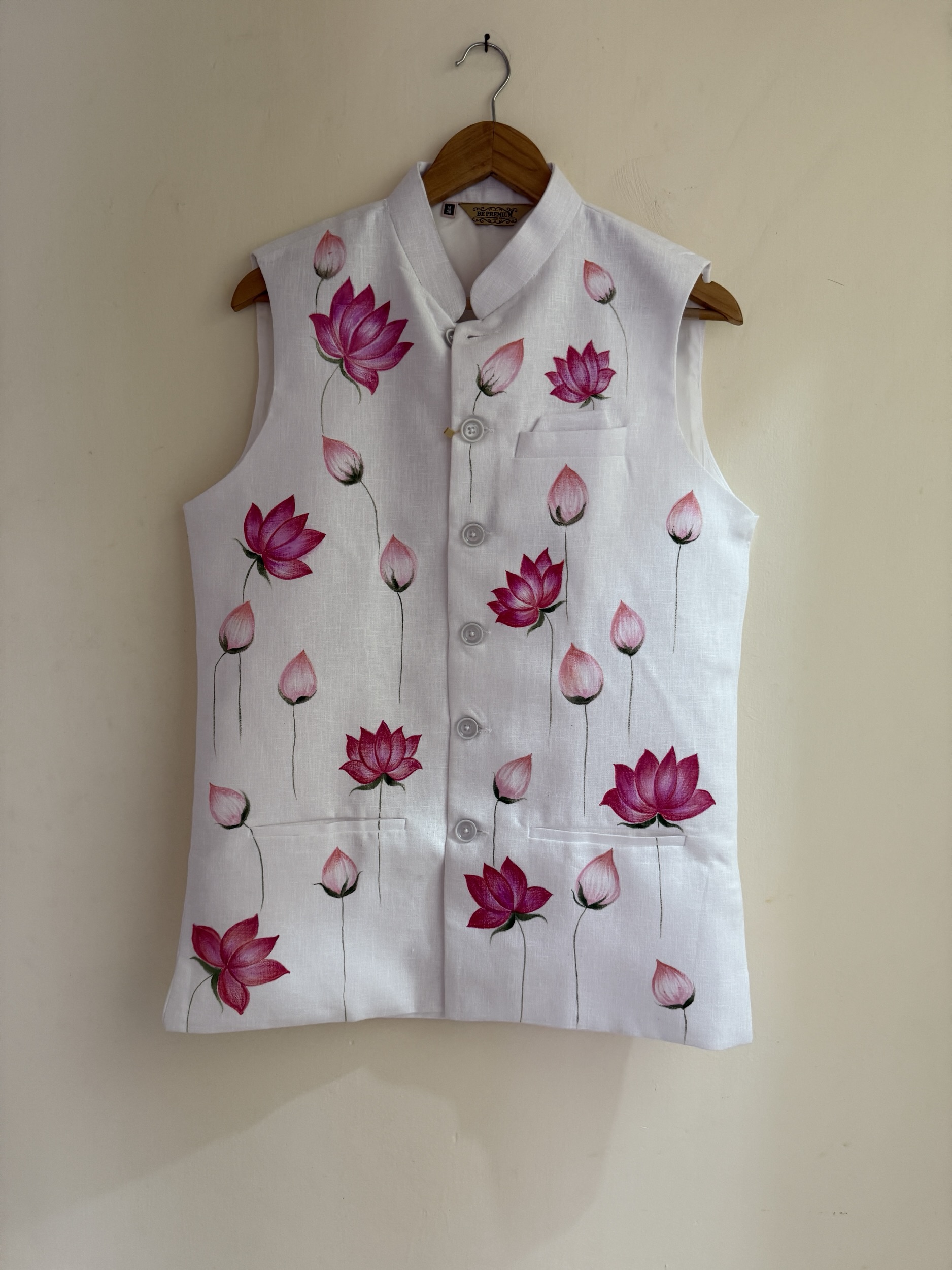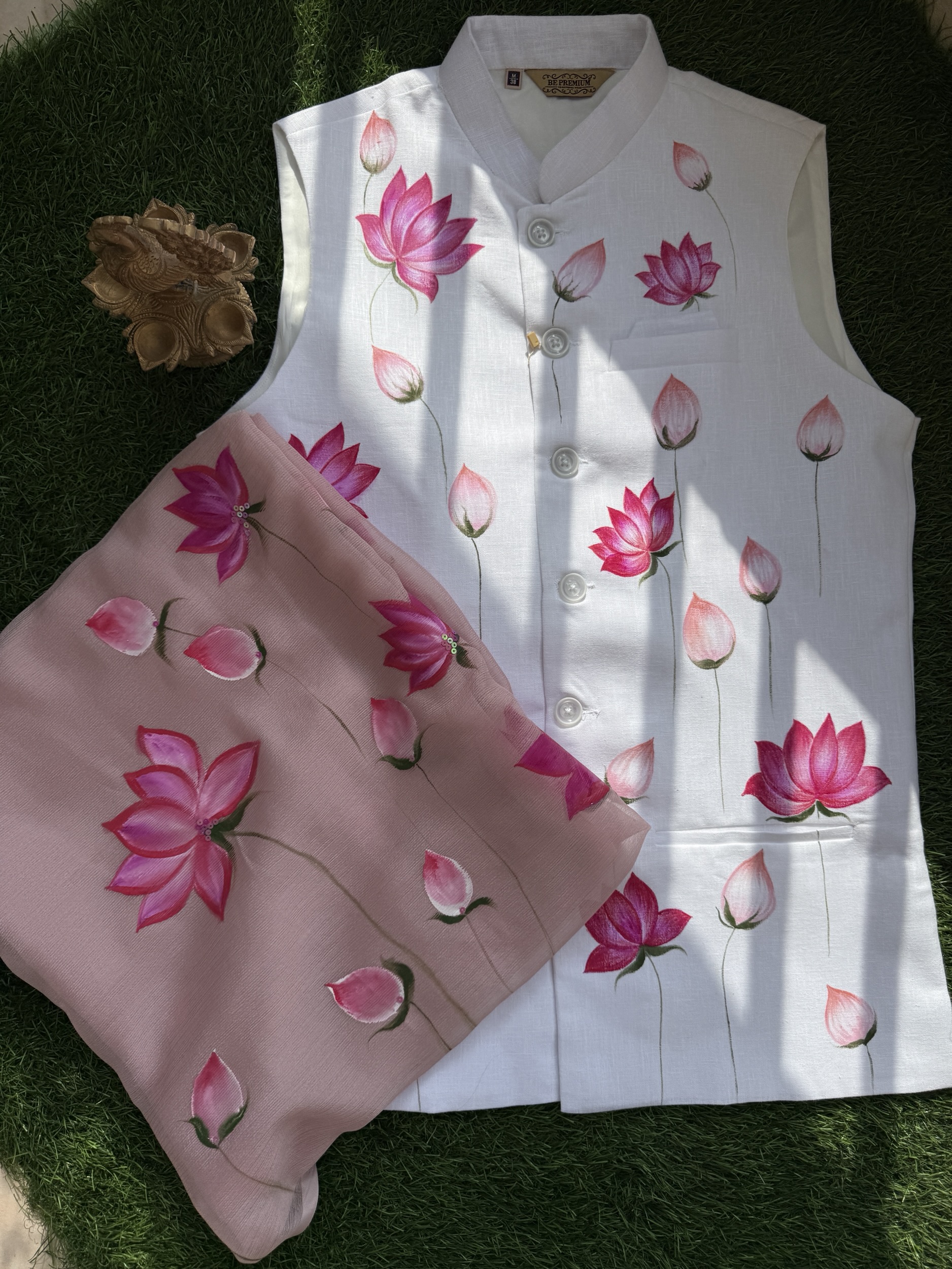 Introducing our Special Edition Hand-Painted Combo by SoulHues- a beautiful pairing of a linen-cotton Nehru jacket and a soft organza silk saree, both adorned with delicately hand-painted pichwai lotus motifs, using the best quality colors and fabric.