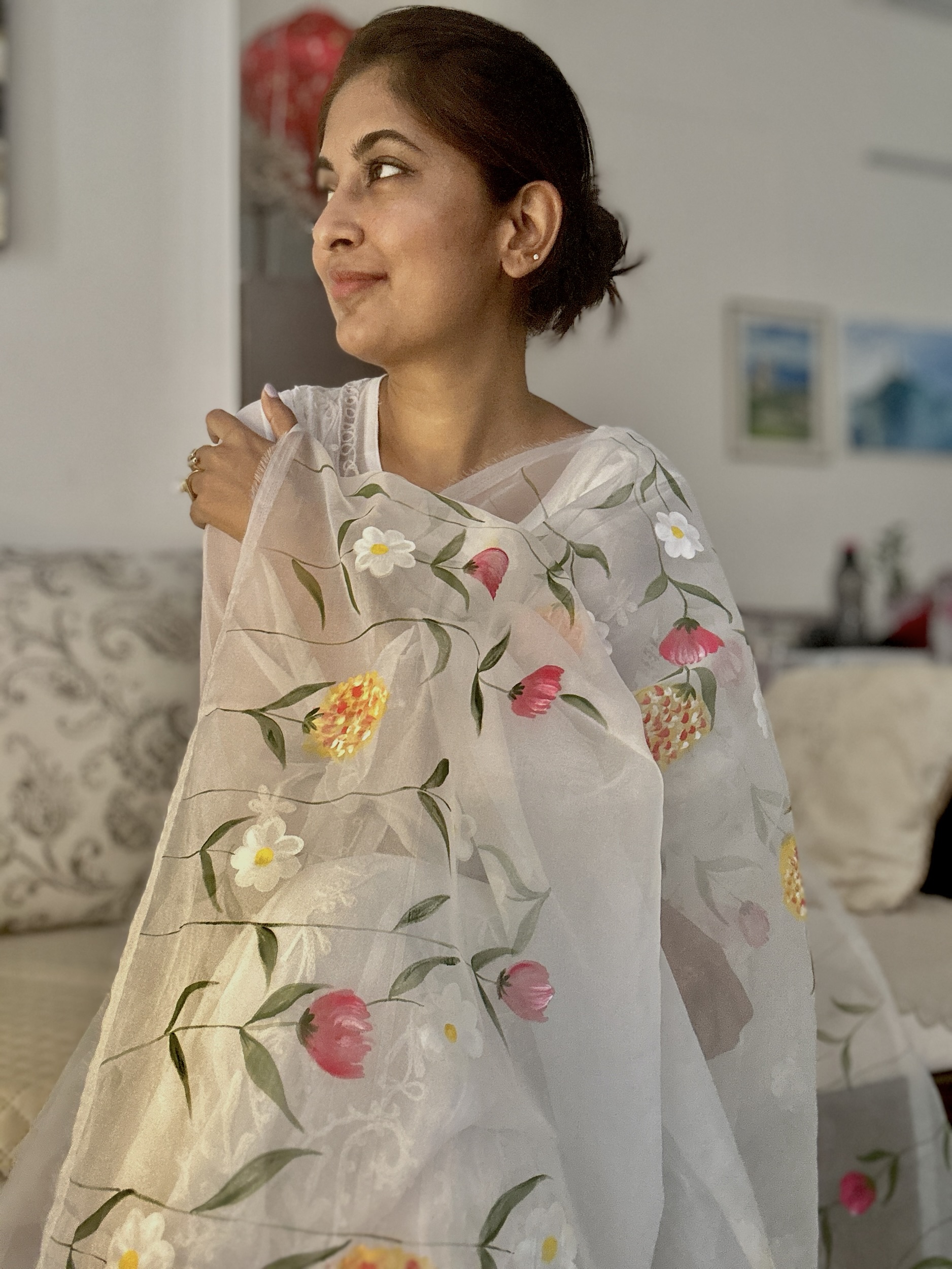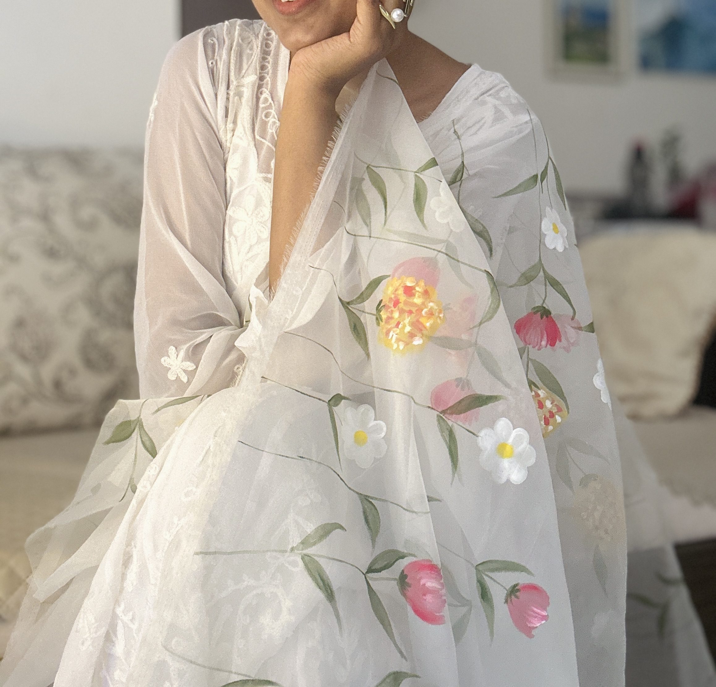 Hand painted organza dupatta crafted for organza lovers, designed to enhance elegance with lightweight grace and artistic detailing. Each piece is carefully hand painted, making it unique and timeless.