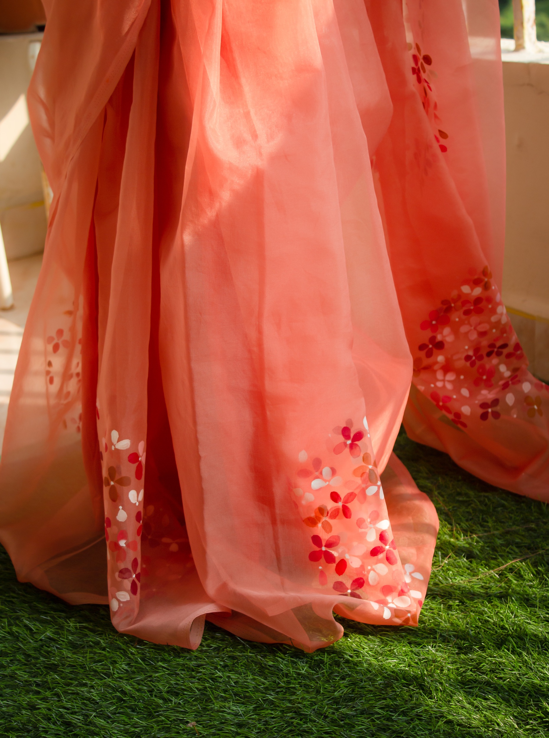 Color: Peach Color Saree base with hand-painted red gigantic flowers