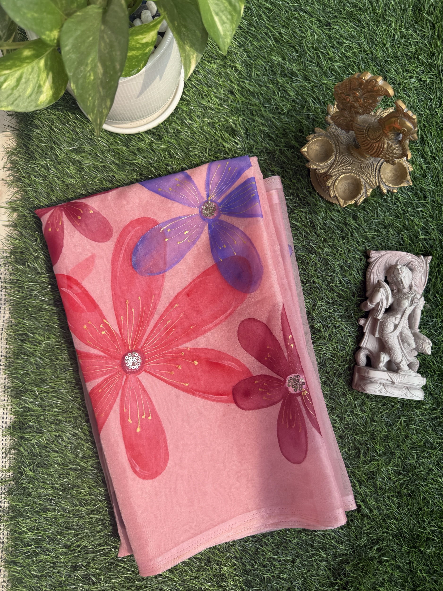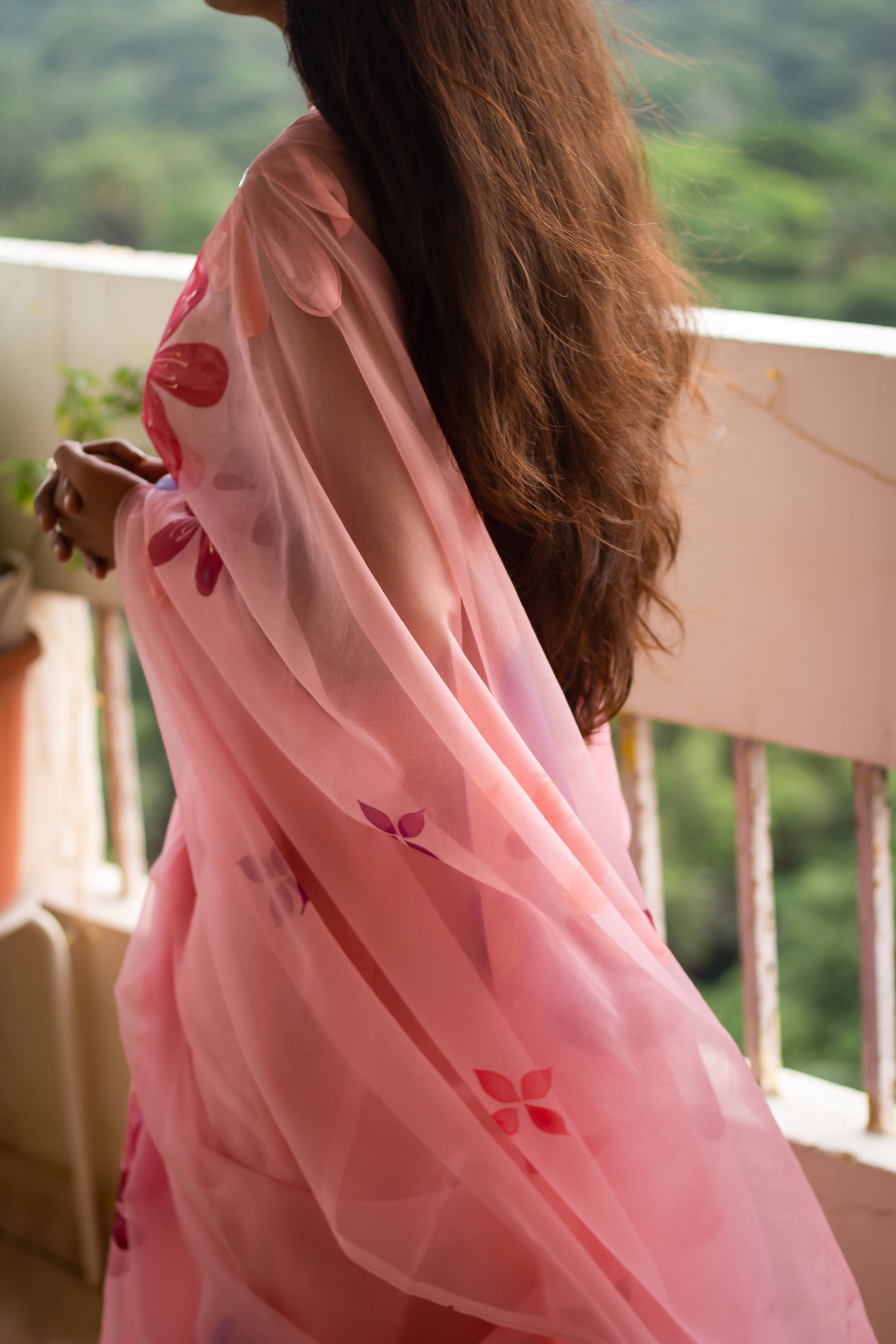A graceful organza saree hand-painted with delicate pink floral motifs, blending elegance with artistic charm. Perfect for weddings, festive wear, and special occasions.