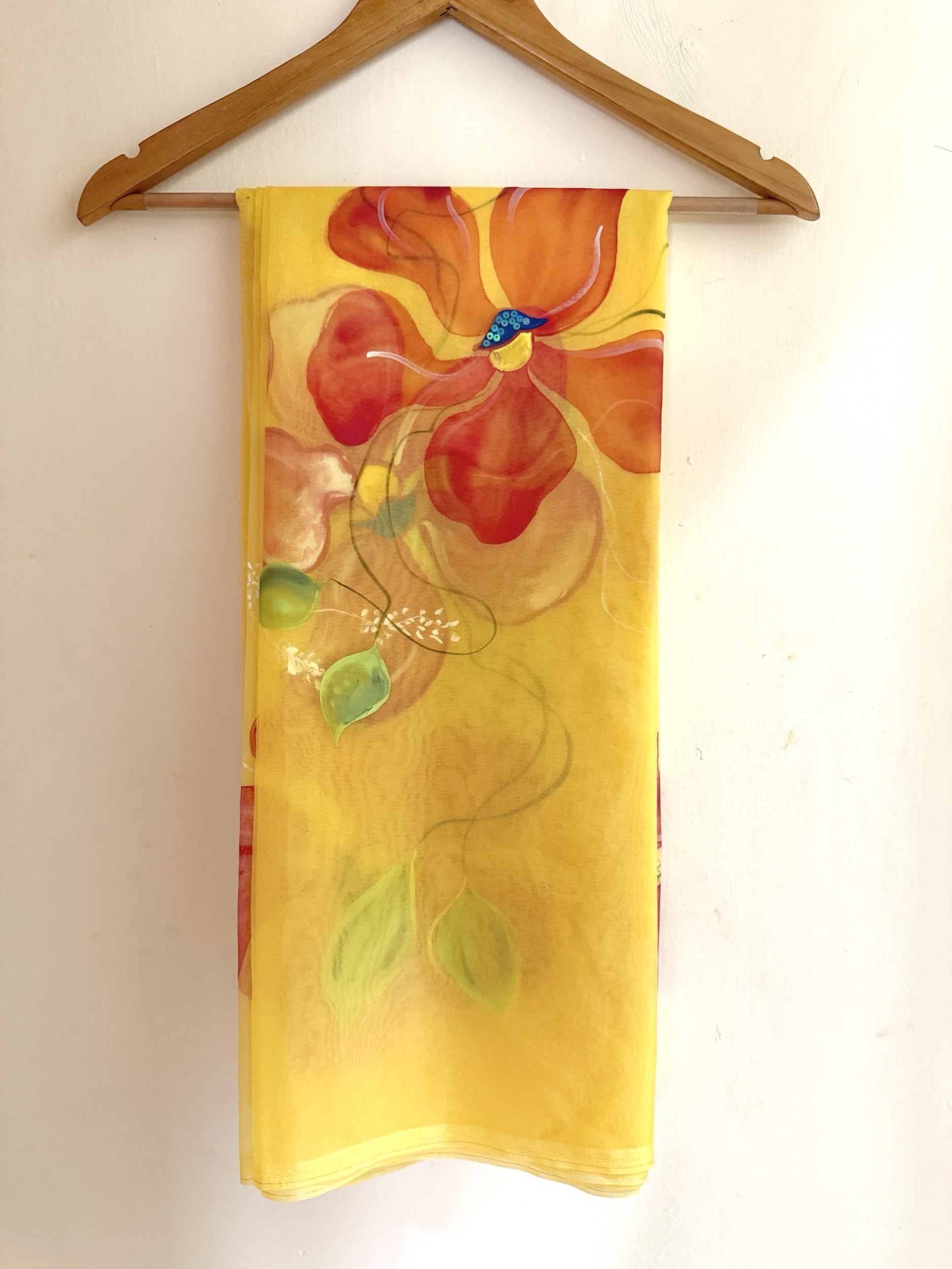 Color: Sunshine Yellow base with hand-painted red gigantic flowers