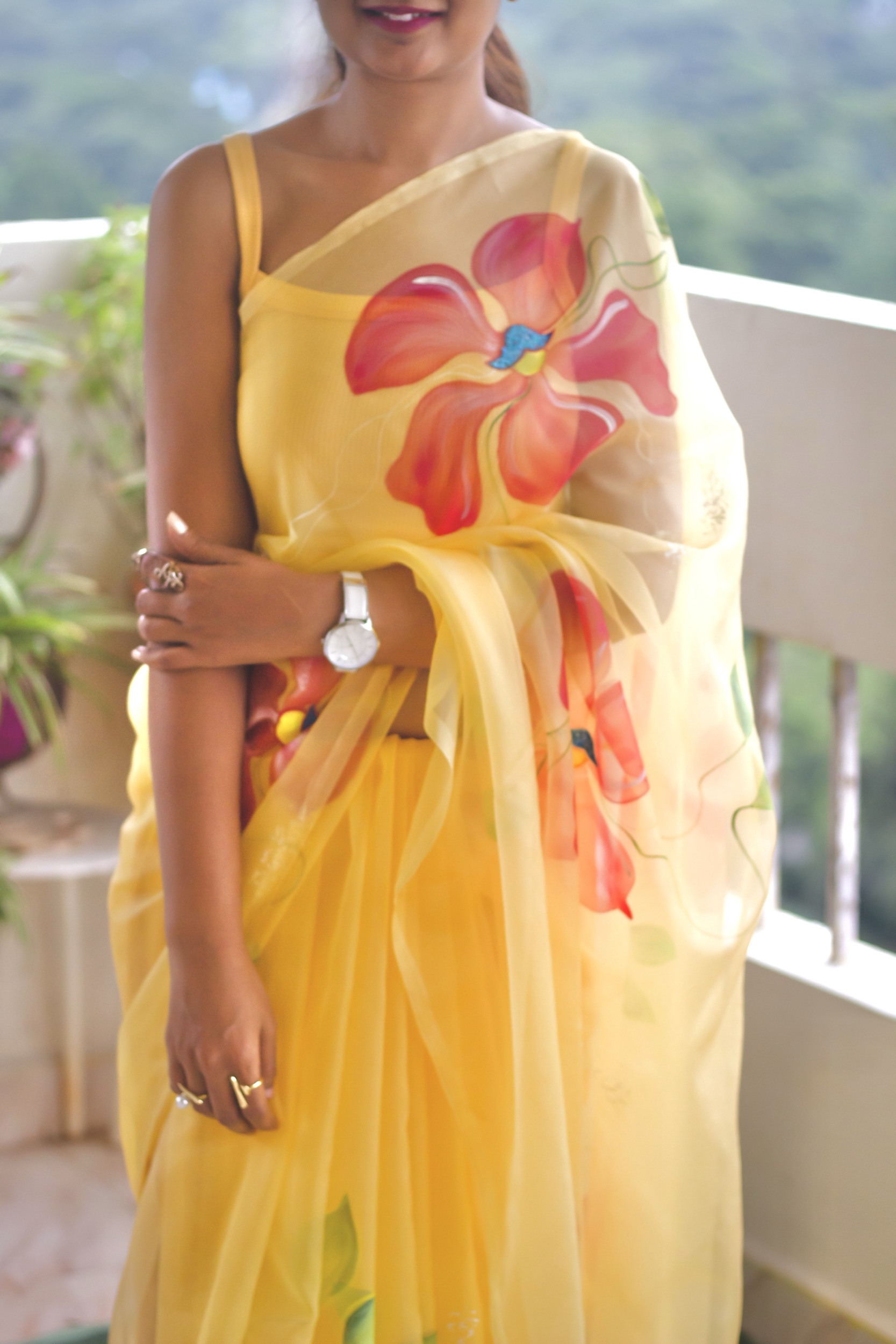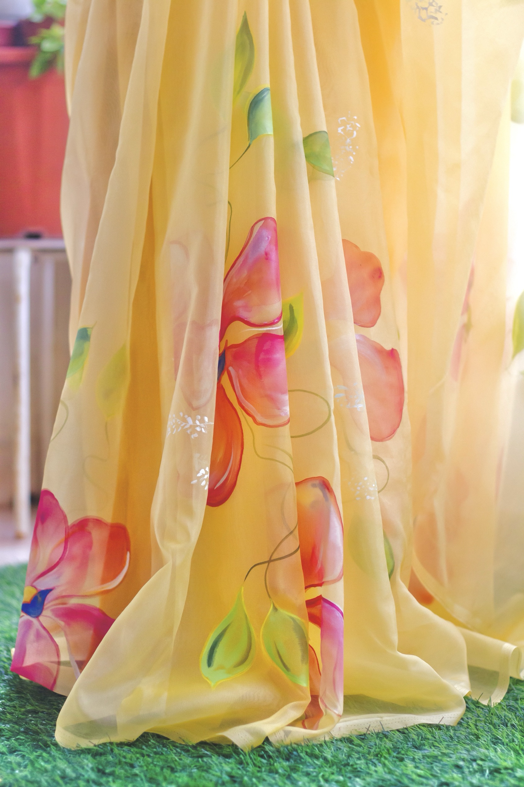 A radiant yellow organza silk saree, hand-painted with bold and beautiful red gigantic flowers—perfect for those who love statement art on luxurious fabric.