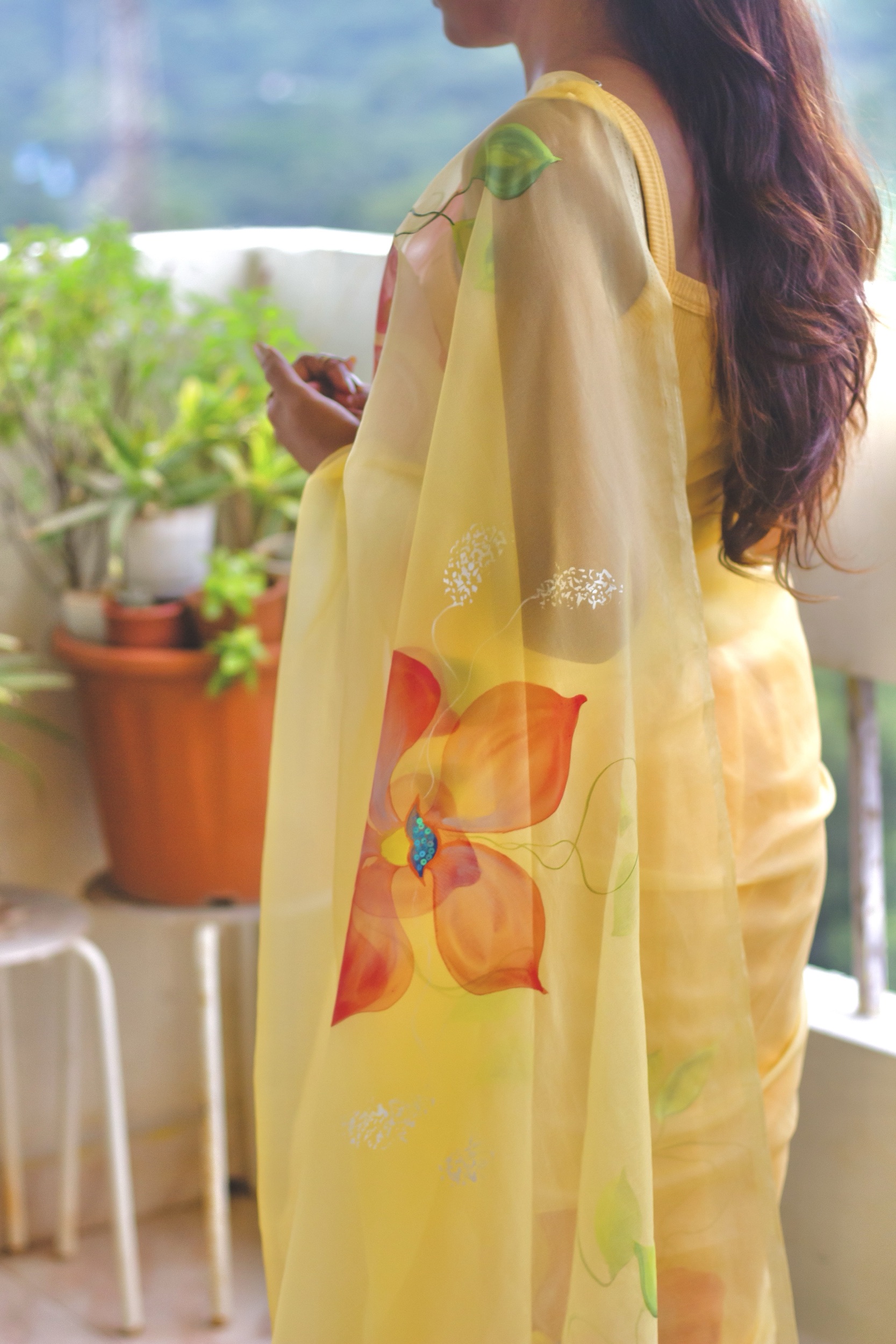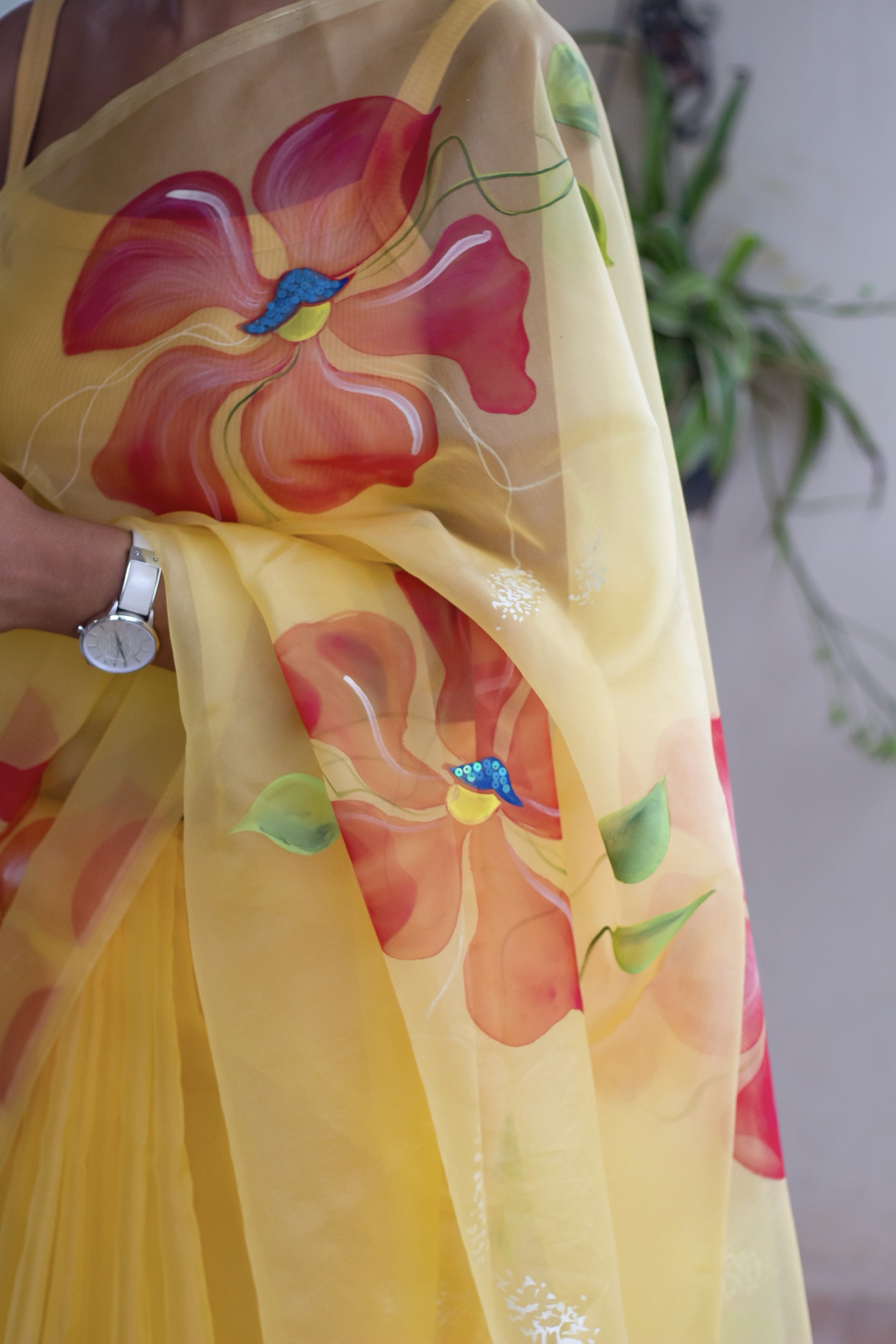 Inspired by vibrant summer blossoms, this saree combines traditional craftsmanship with contemporary elegance. The translucent organza drape enhances the striking floral artwork, making it ideal for festive events, daytime weddings, haldi ceremonies, cultural gatherings, or any celebration where you want your style to stand out effortlessly.