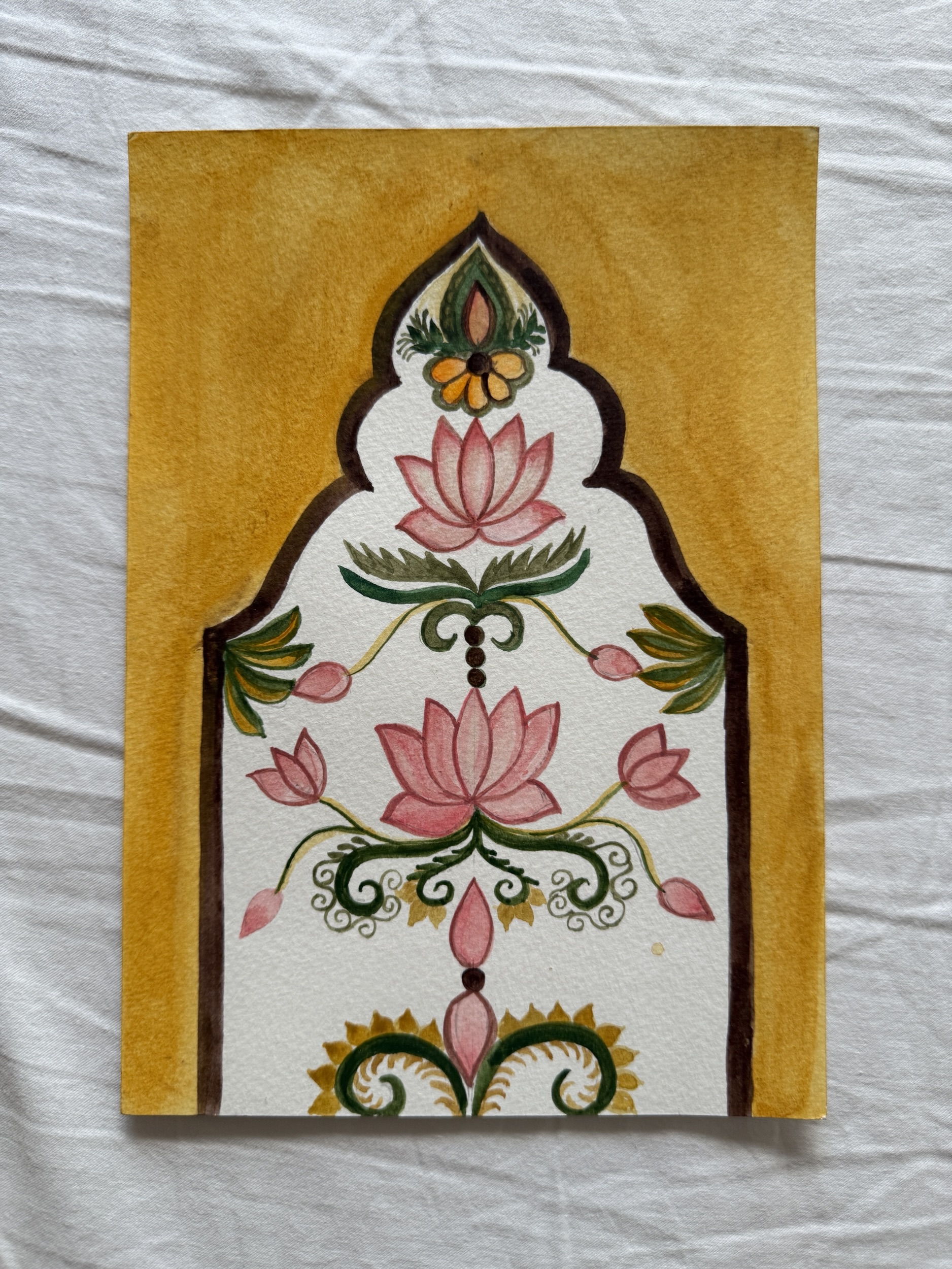 A miniature A5 watercolor painting inspired by traditional Pichwai art, featuring delicate lotus motifs framed within an ornate jharokha (window). Ideal for ethnic décor or gifting.