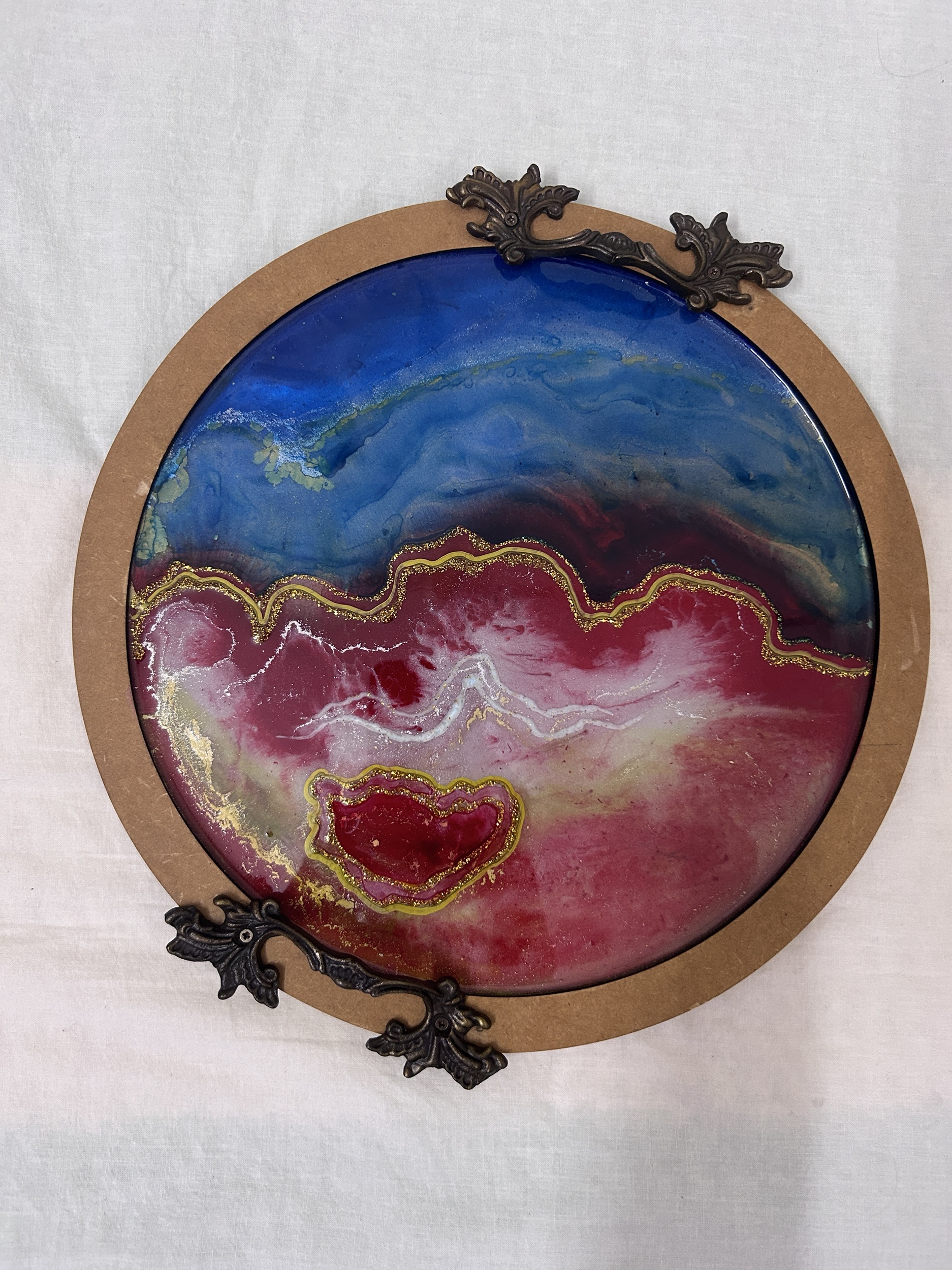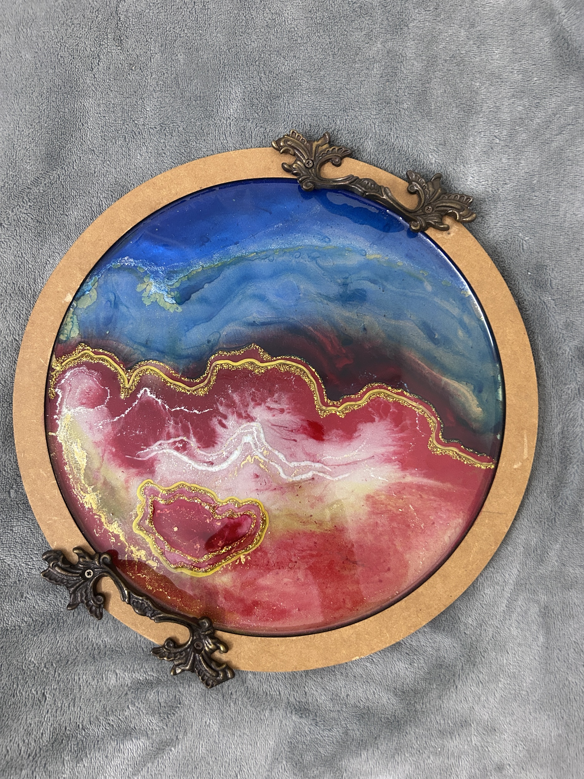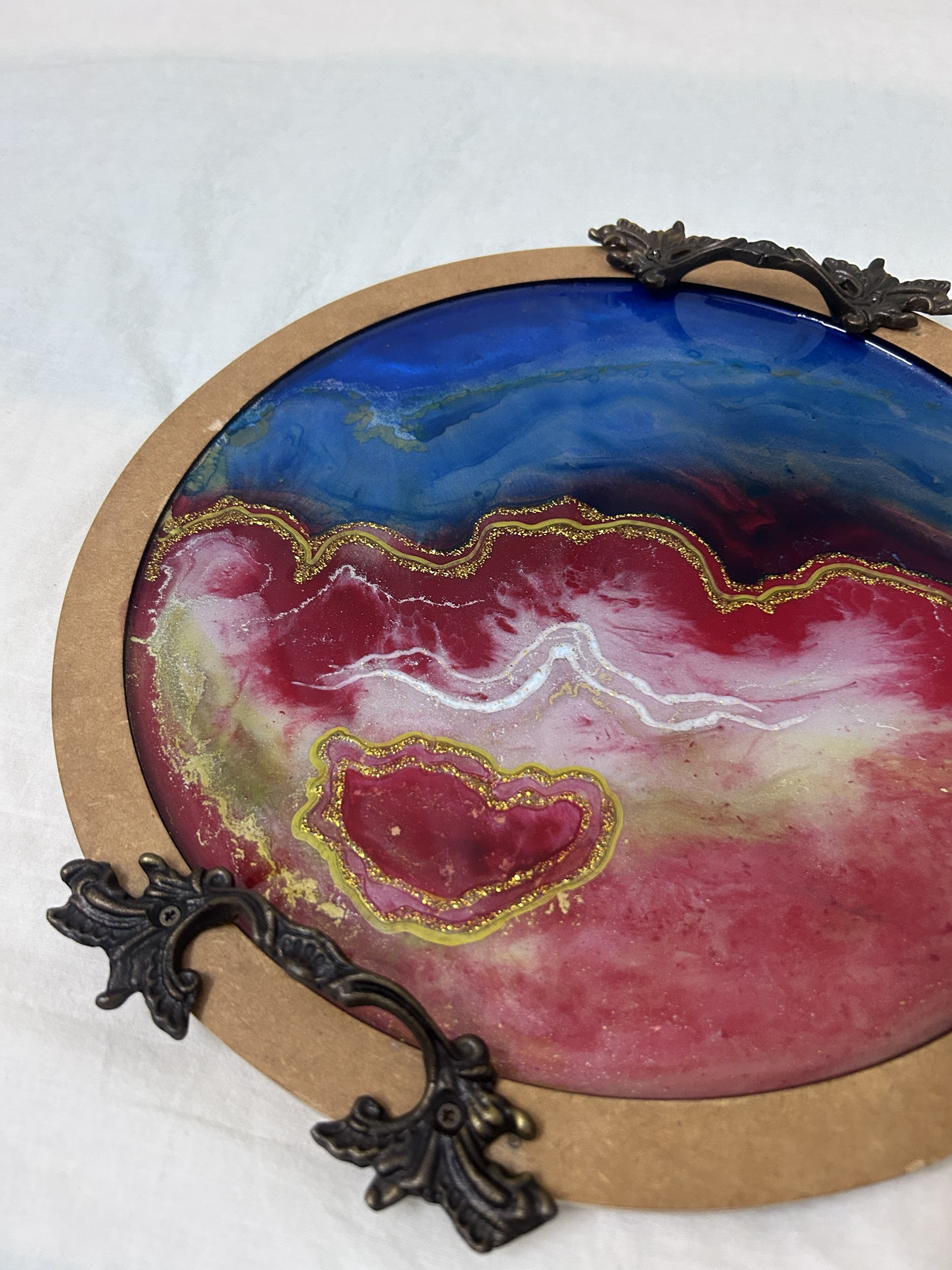 Resin Tray Made on Wooden Base, 3D Painting, Pink, Red, Gold Pigments And Colors, Abstract art Piece for decoration use with beautiful antique handles.