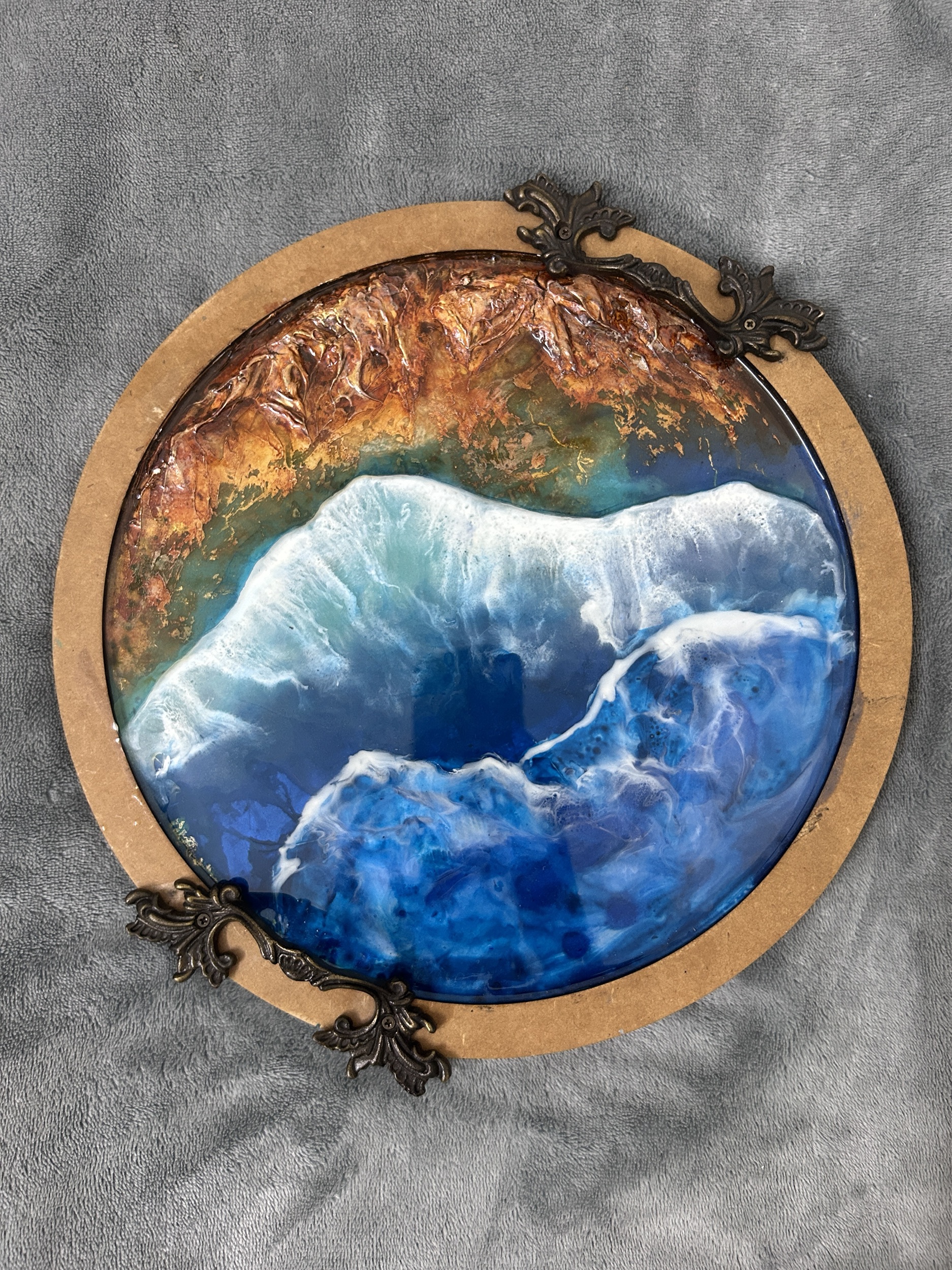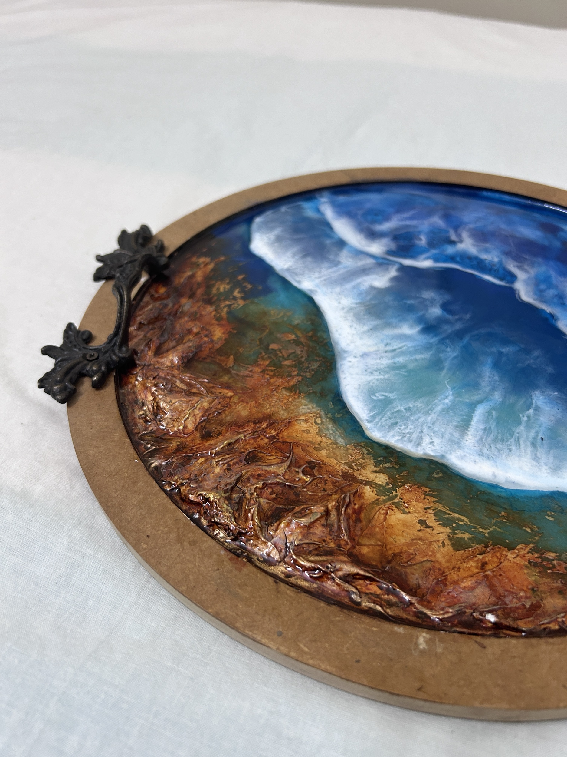 Resin Tray Made on Wooden Base, 3D Beach waves with blue white Pigments And Colors, Abstract art Piece for decoration use with beautiful antique handles.