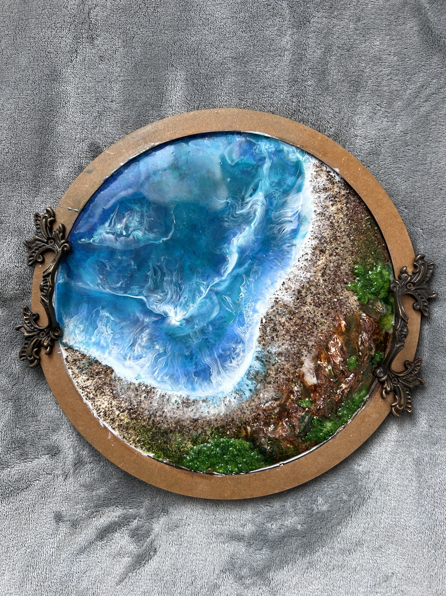 Resin Tray Made on Wooden Base, 3D Beach waves with blue white Pigments And Colors, Abstract art Piece for decoration use with beautiful antique handles.