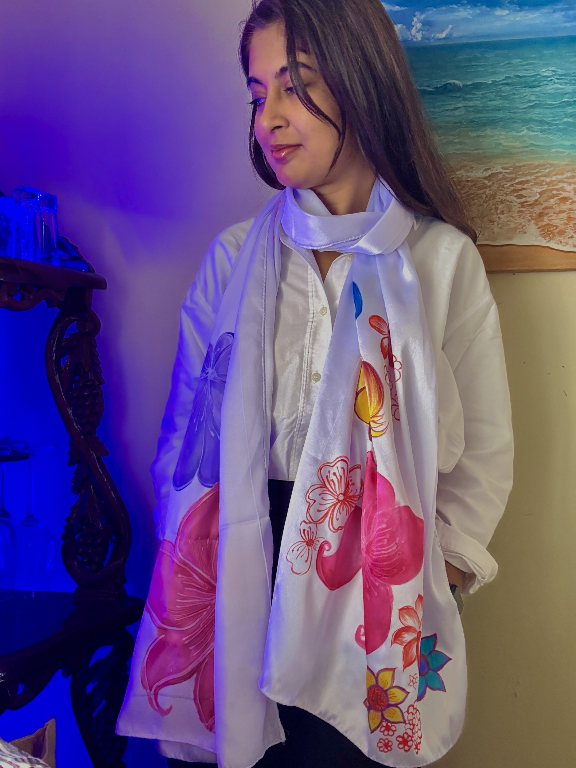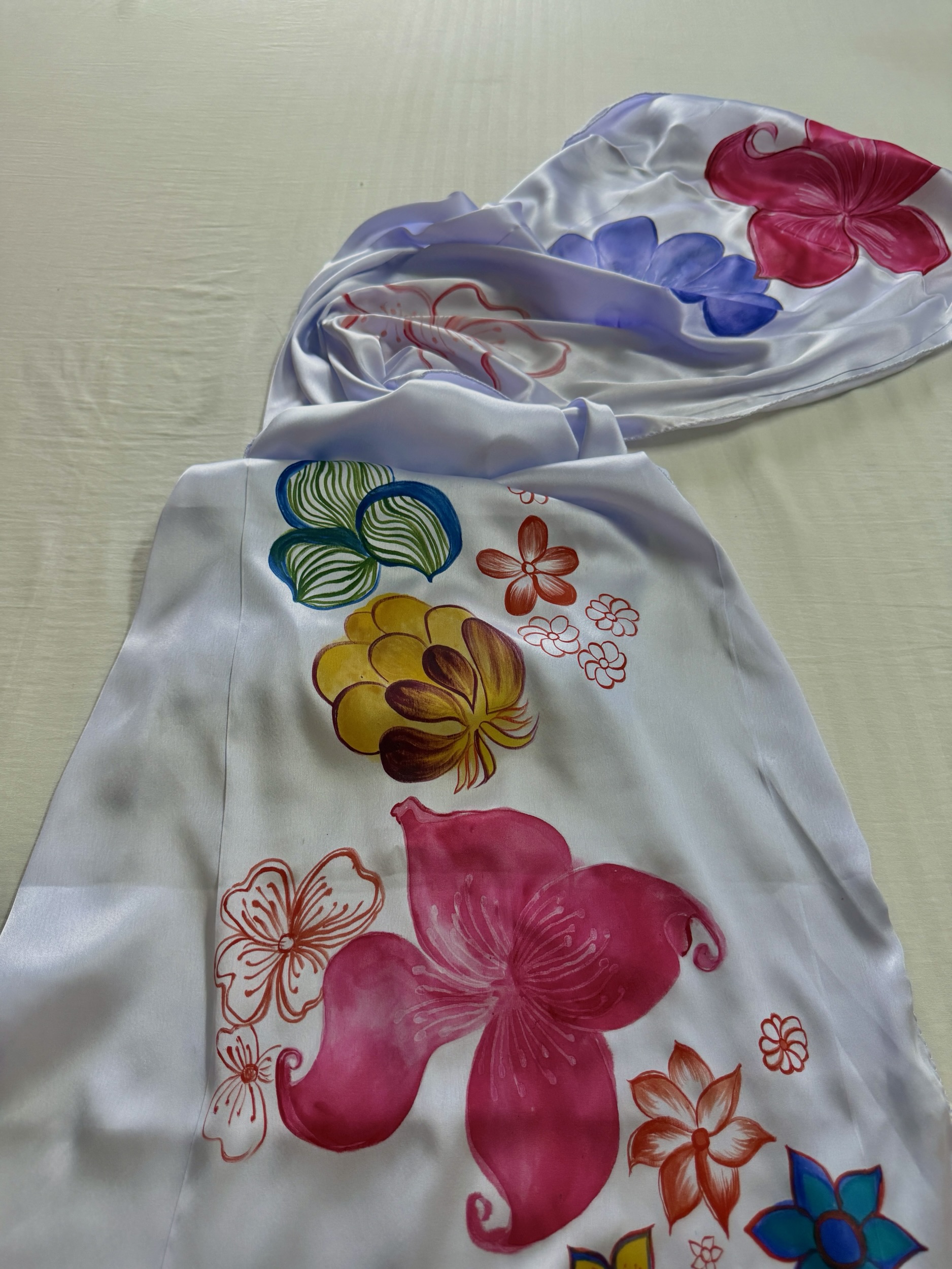 This hand painted satin silk scarf features vibrant abstract floral artwork, blending elegance with affordability. Crafted on soft satin silk, it offers a smooth texture and a graceful drape, making it a versatile accessory for both everyday wear and special occasions.