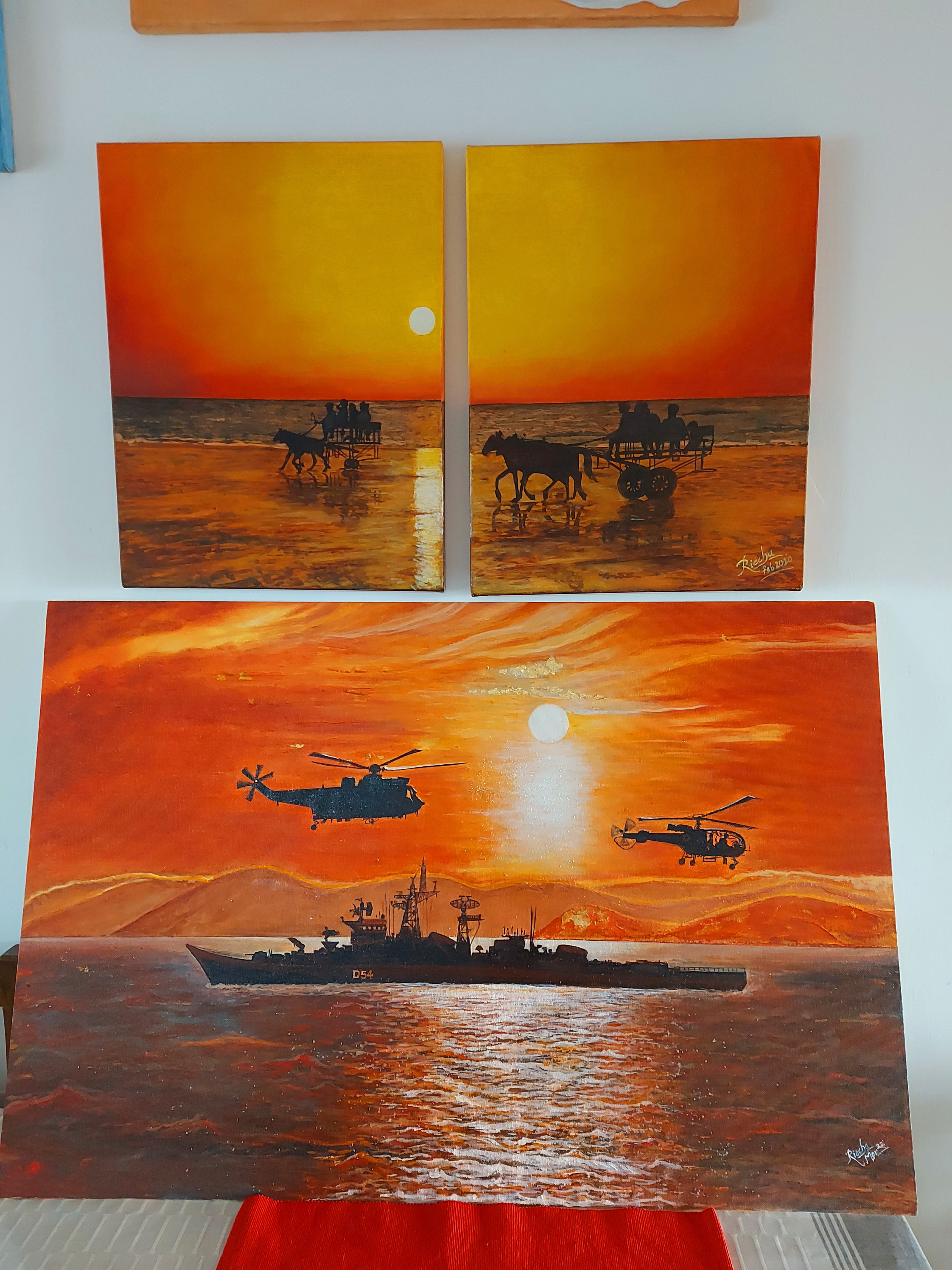 Perfect for: Modern interiors, beach-themed decor, art lovers, or luxury gifting.Original Hand painted. Painted with shades of scarlet and chrome yellow. Bit of Acrylic colours are used for extra depth. Best viewed from 1 or 2 meters.