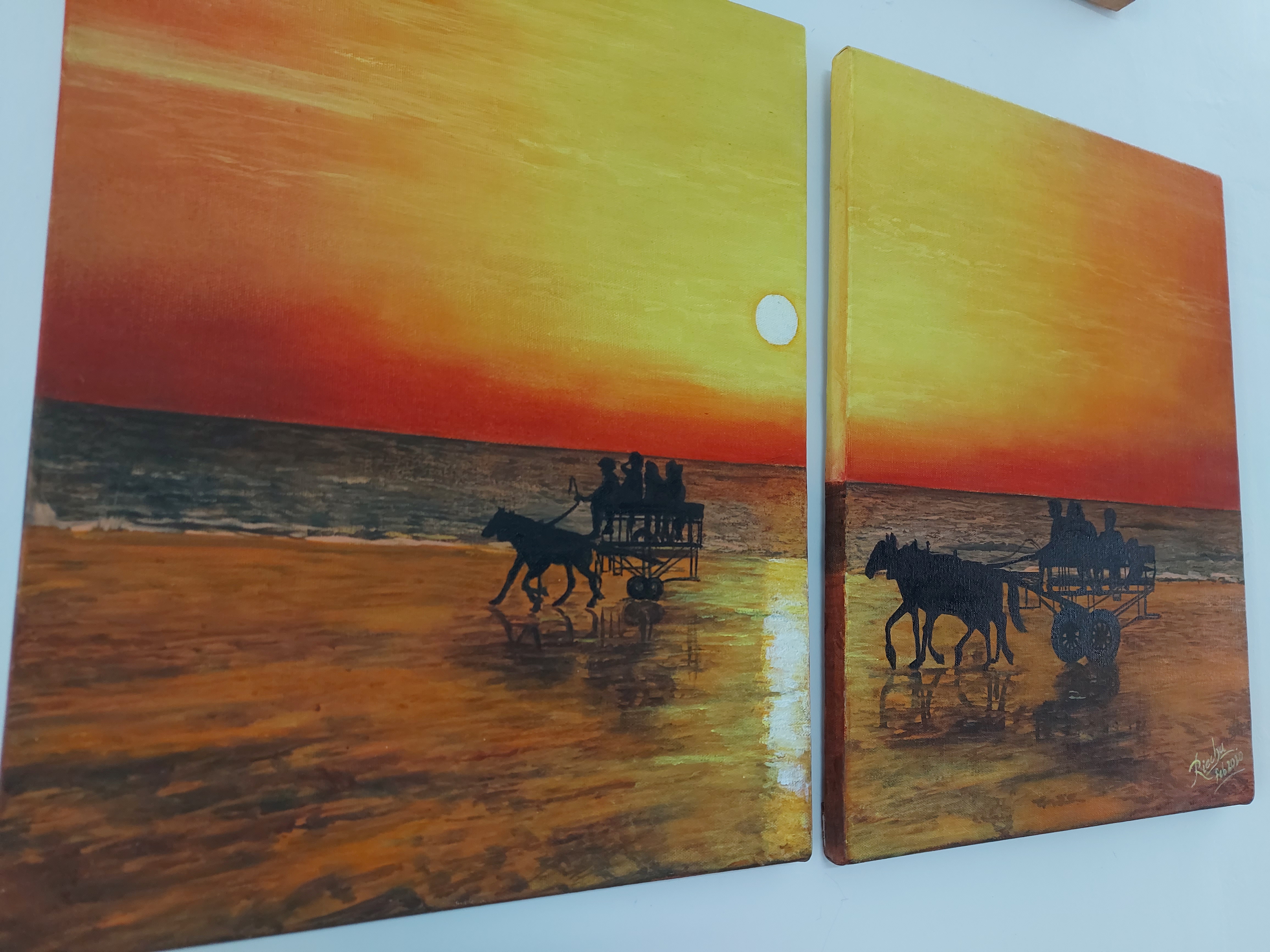 Transform your space with this Set of 2 original oil paintings titled “Sunset at the Beach”, painted on high-quality stretched canvas. Each panel (18×24 inches) presents a unique yet connected view of a radiant ocean sunset. Together, they create a panoramic beach scene glowing with warm tones and textured brushwork.